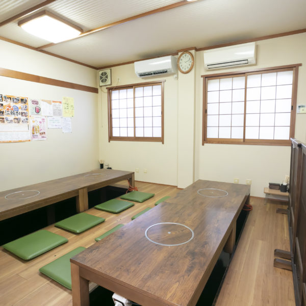 内観 団体さまにも対応!広々個室 10〜16人ほどでご利用いただける個室です。 掘りごたつで足元らくらく、おくつろぎいただけます。 仲間との打ち上げや、パーティーなど、気兼ねなくおしゃべりいただけます。 NEXT