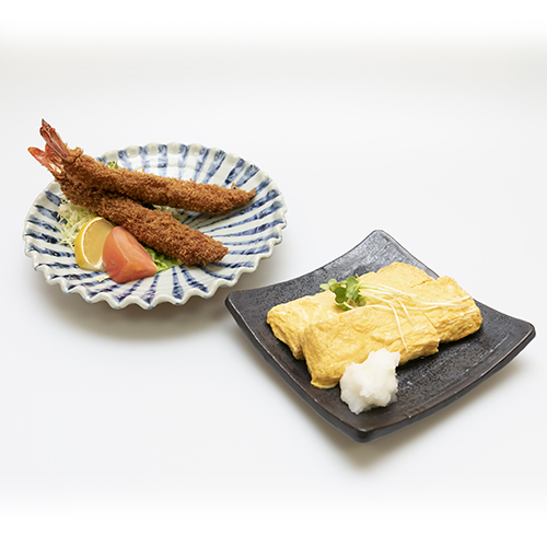 「だし巻き」や「大きなエビフライ(2本)」など、わらじ家で大人気のお料理のご紹介です。